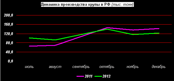 По данным Росстата, в декабре 2012г. российские предприятия произвели 122,0 тыс. т крупы, что на 4,9% больше, чем в ноябре 2012г., но на 13,9% меньше, чем в декабре 2011г.