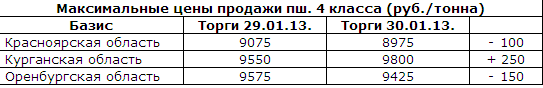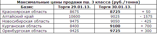 Основной итог сегодняшних торгов, разумеется ценовой. Алтайский край, который несколько торговых дней подряд бил рекорды максимальных цен, рухнул на 1575 рублей. Самая высокая цена, которую сегодня дали за 3 класс - 9725 руб./тонна (на базисе Оренбургской области). Это соответствует, примерно, максимальной цене на 19 декабря. Еще больше подешевела средняя максимальная цена.