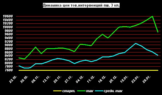 На интервенционные торги 30 января было выставлено 60,212 тыс. тонн пшеницы на сибирских и уральских базисах. В том числе 43,762 тыс. тонн пшеницы 3 класса и 16,45 тыс. тонн пшеницы 4 класса. Объем торгов по 4 классу – самый большой с начала нынешних интервенций.
