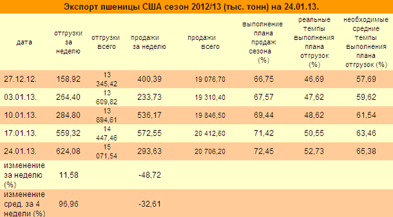 Итоги недельных (на 24 января) экспортных продаж американской пшеницы 2012г. оказались неожиданно неприятными для трейдеров. Несмотря на серьезное снижение в период с 21 по 24 января котировок на биржах США.