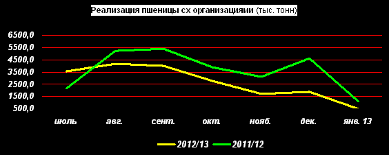 За январь 2013г. сельхозорганизации РФ, по данным Росстата, реализовали 497 тыс. тонн пшеницы. Это почти на 56% меньше, чем было реализовано за январь прошлого года. Причем темпы снижения реализации (на 74%) почти совпадают с прошлогодними (75,4%).