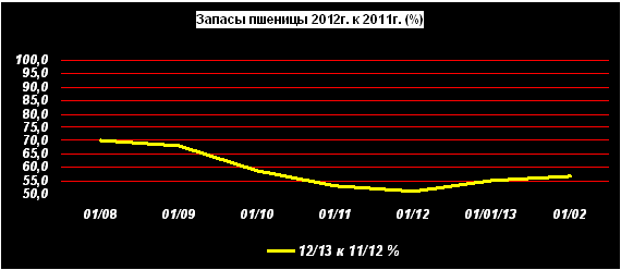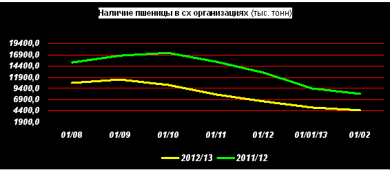 На 01 февраля 2013г. в запасах у сельхозорганизаций находилось 4,69 млн. тонн пшеницы. Это на 43,2% меньше, чем в прошлом году.