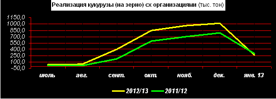 За январь 2013г. сельхозорганизации РФ, по данным Росстата, реализовали 272 тыс. тонн кукурузы (на зерно). Это на 9,5% меньше, чем за январь прошлого года.