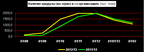 На 01 февраля 2013г. в запасах у сельхозорганизаций находилось 1,08 млн. тонн кукурузы. Это на 8,5% меньше, чем год назад.