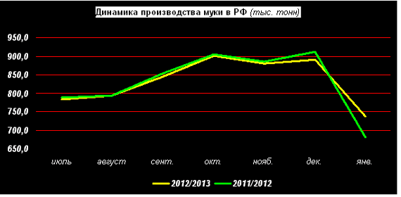 По данным Росстата, в течение первого месяца текущего года российские предприятия произвели 737,0 тыс. т муки, что на 17,3% меньше, чем в декабре 2012г., но на 7,5% больше, чем в январе 2012г.