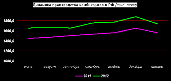 По данным Росстата, в январе 2013г. предприятия РФ произвели 1 738,8 тыс. т комбикормов, что на 7,3% меньше, чем месяцем ранее. По сравнению с январем 2012г. объем производства комбикормов вырос на 11,3%.
