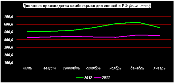 Объем производства комбикормов для птиц достиг 1 008,8 тыс. т (+8,2% к январю 2012г.), для свиней – 555,9 тыс. т (+22,4%), для КРС – 169,5 тыс. т (-1,5%), для прочих животных – 2,8 тыс. т.