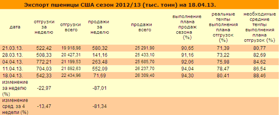 Итоги недельных (на 18 апреля) экспортных продаж американской пшеницы 2012г. и будущего урожая 2013г. после рекордных 1,675 млн. тонн неделю назад оказались провальными. При ожиданиях рынка в диапазоне 500-800 тыс. тонн, все продажи составили 306,43 тыс. тонн. При этом доля пшеницы 2012г. лишь 23,4%.