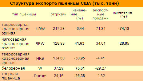 Главными покупателями пшеницы 2012г. на неделе стали: Египет (63 000 тонн), Япония (59 100), Чили (31 100), Конго (27 500), Сальвадор (15 900) и Колумбия (12 000). От ранее законтрактованной пшеницы отказались: неназванный покупатель (93 100 тонн), Филиппины (42 000) и Нигерия (27 500).