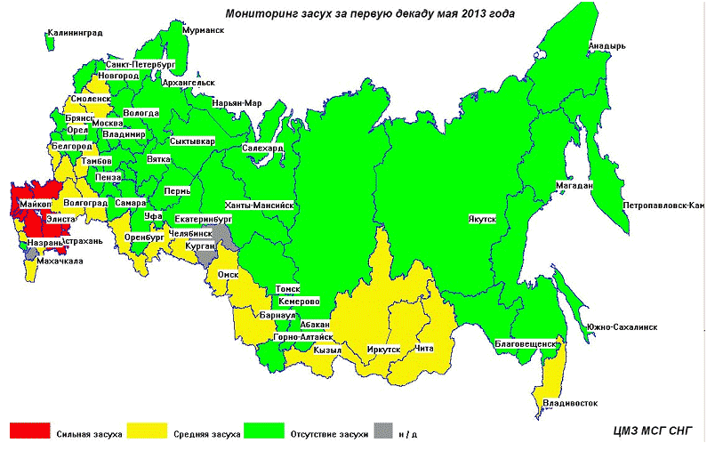 Краткий обзор особенностей распределения засух различной интенсивности по территории России за первую декаду мая 2013 года составлен в Центре мониторинга засухи (ЦМЗ) МСГ НГМС СНГ на базе ФГБУ «ВНИИСХМ»