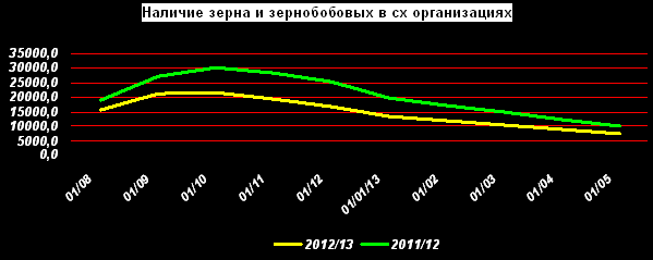 На 01 апреля 2013г. в запасах у сельхозорганизаций находилось 7,3 млн. тонн зерна. Это на 27,9% меньше, чем в прошлом году. кстати, темпы сокращения запасов (18,2%) почти сравнялись с прошлогодними (18,8%).