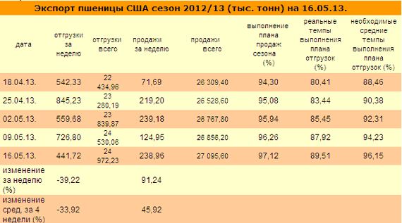 Итоги недельных (на 16 мая) экспортных продаж американской пшеницы 2012г. и будущего урожая 2013г. составили 952,561 тыс. тонн и существенно превысили верхнюю границу ожиданий трейдеров и экспертов (400-700 тыс. тонн). Возможно, итоги экспортной недели станут одним из факторов поддержки биржевых торгов.