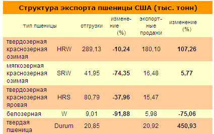 В продажах старого урожая безоговорочно доминировала твердая озимая пшеница HRW (свыше 75%), видимо, как самая проблемная позиция урожая будущего. В продажах нового урожая лидировала уже твердая яровая пшеница HRS (свыше 44%).