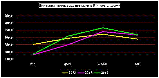 С января по апрель 2013г. в РФ было произведено 3,158 млн. т муки, что примерно равно показателю за тот же период в прошлом сезоне.