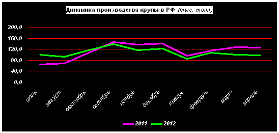 По данным Росстата, в апреле текущего года российские предприятия произвели 100 тыс. т крупы, что на 20% меньше, чем в апреле 2012г.
