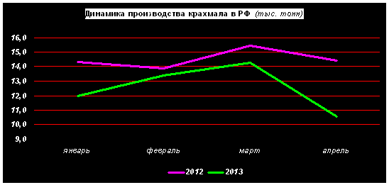 немодифицированного крахмала, что является самым низким показателем с июля 2009г., в течение которого было изготовлено 10,2 тыс. т. По сравнению с мартом 2013г. производство крахмала сократилось на 26%, по сравнению с апрелем 2012г. – на 27%.