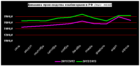 По данным Росстата, в апреле 2013г. российские предприятия произвели 1 831 тыс. т комбикормов, что на 9% больше, чем в апреле 2012г.