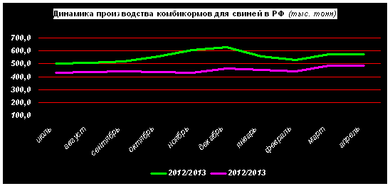 Для свиней в апреле было изготовлено 572 тыс. т комбикормов (+17% по сравнению с апрелем 2012г.), для КРС – 174 тыс. т (-4%).