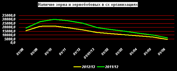 На 01 мая 2013г. в запасах у сельхозорганизаций находилось 4,53 млн. тонн зерна. Это на 29,5% меньше, чем в прошлом году. Темпы помесячного сокращения запасов (37,8%) оказались чуть выше прошлогодних (36,4%).