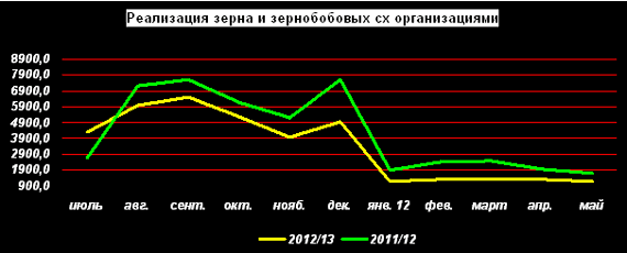 За май 2013г. сельхозорганизации РФ, по данным Росстата, реализовали 1,2 млн. тонн зерна. Это на 29% меньше показателя реализации мая прошлого года.
