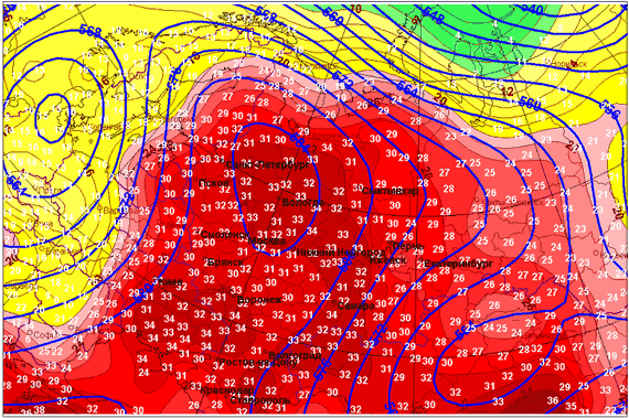 Поле приземной максимальной температуры очень хорошо коррелирует с полем геопотенциала H-500 гПа, на котором хорошо виден высокий блокирующий антициклон.