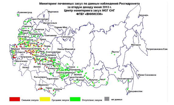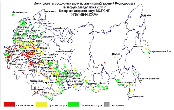 Дальневосточный федеральный округ. Во второй декаде июня на территории округа (за исключением отдельных районов) засушливые явления отсутствовали. В земледельческой зоне Якутии преобладала атмосферная засушливость средней интенсивности.