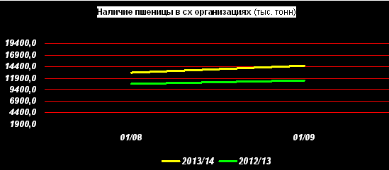 На 01 сентября 2013г. в запасах у сельхозорганизаций находилось 14,6 млн. тонн пшеницы. Это почти на 28% больше, чем на начало сентября прошлого года, но на 13,1% меньше, чем на 01 сентября 2011г.