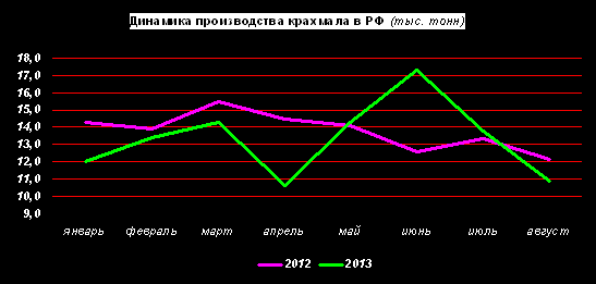 По данным Росстата, в прошлом месяце российские предприятия произвели 11 тыс. т немодифицированного крахмала, что на 21% меньше, чем в июле и на 10% ниже показателя августа 2012г.