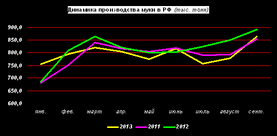 В ЦФО и СЗФО производство муки выросло на 3% по сравнению с сентябрем 2012г. Резкое увеличение показателей производства муки произошло в СКФО, главным образом, за счет возобновления мукомольного производства в Ингушетии.