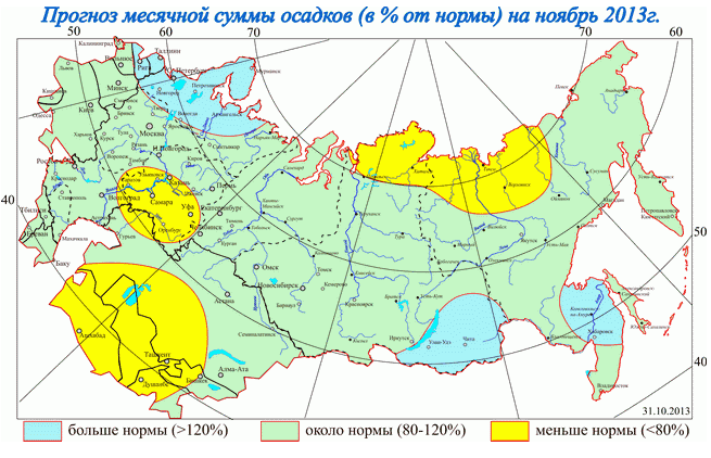 Месячное количество осадков предполагается на большей части территории около среднего многолетнего количества; на западе Северо-Западного федерального округа – больше; на юге Приволжского федерального округа – меньше его.