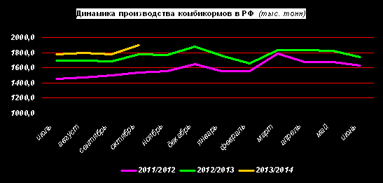 По данным Росстата, в октябре в РФ было произведено 1 897 тыс. т комбикормов, что на 7% больше, чем в предыдущем месяце и на 6% больше, чем в октябре 2012г.