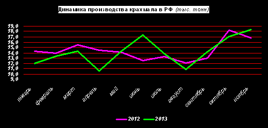 По данным Росстата, в ноябре в РФ было произведено 18,4 тыс. т немодифицированного крахмала, что на 8% больше, чем в предыдущем месяце, и на 9% превышает уровень ноября 2012г.