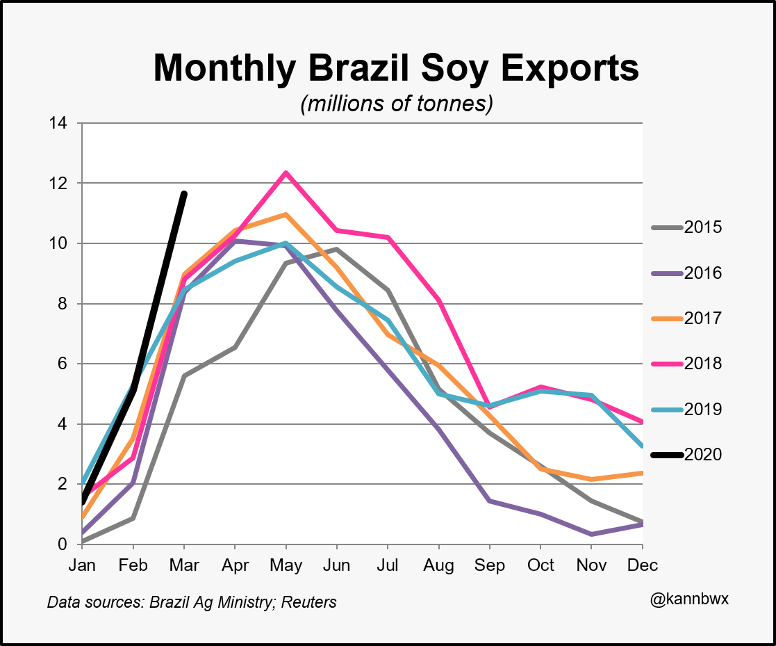 В марте Бразилия экспортировала 11,6 млн. Тонн соевых бобов, что примерно на 30% больше, чем в 2017 году. Это больше, чем рекордный ежемесячный рекорд США в 11,2 млн. тонн, установленный в октябре 2016 года. Для Бразилии это второе место после 12,35 млн. тонн в мае 2018 года.