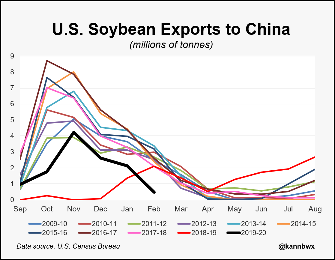 В феврале очень мало американских соевых бобов было отправлено главному покупателю - Китаю, который согласился импортировать рекордную стоимость сельскохозяйственной продукции США в этом году в рамках торговой сделки Чпсти 1. Экспорт сои в Китай в феврале составил 471 761 тонну, что на 78% меньше, чем за год, и является самым низким за месяц с 2000 года.