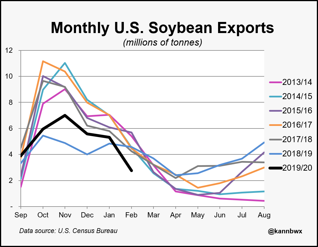 Бразилия почти закончила сбор урожая, который, как ожидается, станет рекордным урожаем сои, и ее недавний экспорт был просто впечатляющим. Бразильские бобы не только дешевле, чем американские, но фермеры активно продавали благодаря девальвации валюты.
