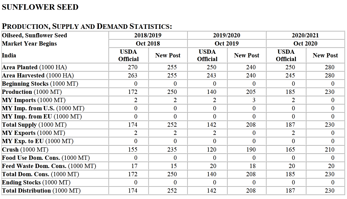 НА МГ 2020/2021 USDA пересматривает производство семян подсолнечника и площади посевов к своему предыдущему прогнозу на 2020/2021 МГ (октябрь-сентябрь) в размере 200 000 метрических тонн (MT) на 230 000 миллионов гектаров до 230 000 (MT) на 280 000 миллионов га. Публикация объясняет изменение более высокими, чем ожидалось, посадками харифа, но по-прежнему считает, что урожайность средняя, и будут происходить нормальные озимые посадки.
