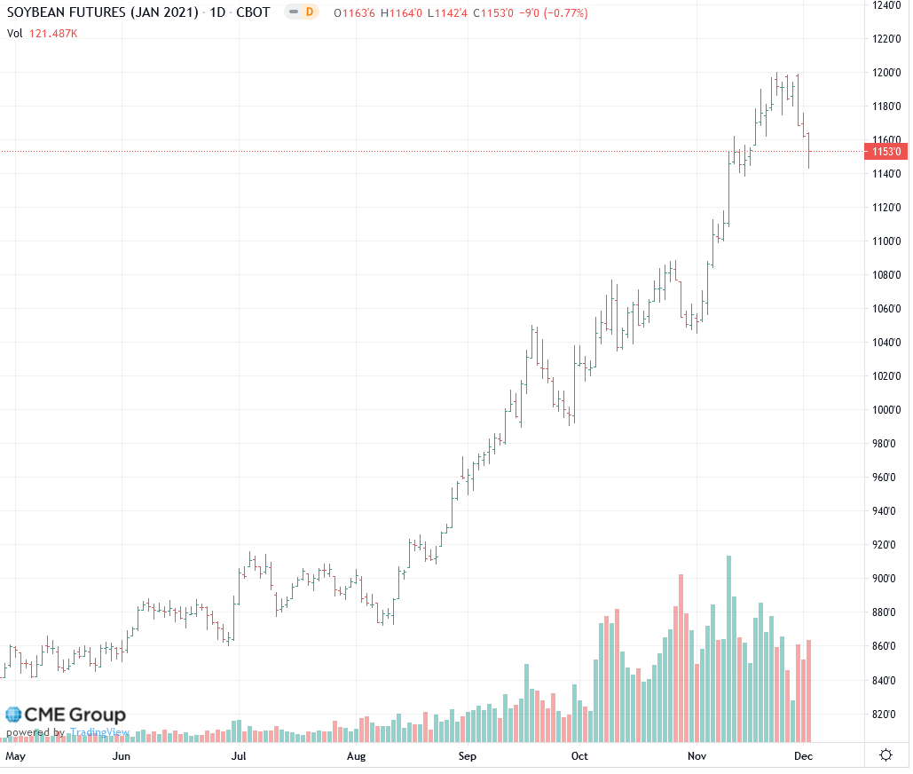 Товарные фонды удерживают значительные доли контрактов в длинных позициях по фьючерсам на сою CBOT, что делает рынок уязвимым для "приступов" длинной ликвидации. Пока что в 2020 году эталонные фьючерсы на сою выросли примерно на 21%.