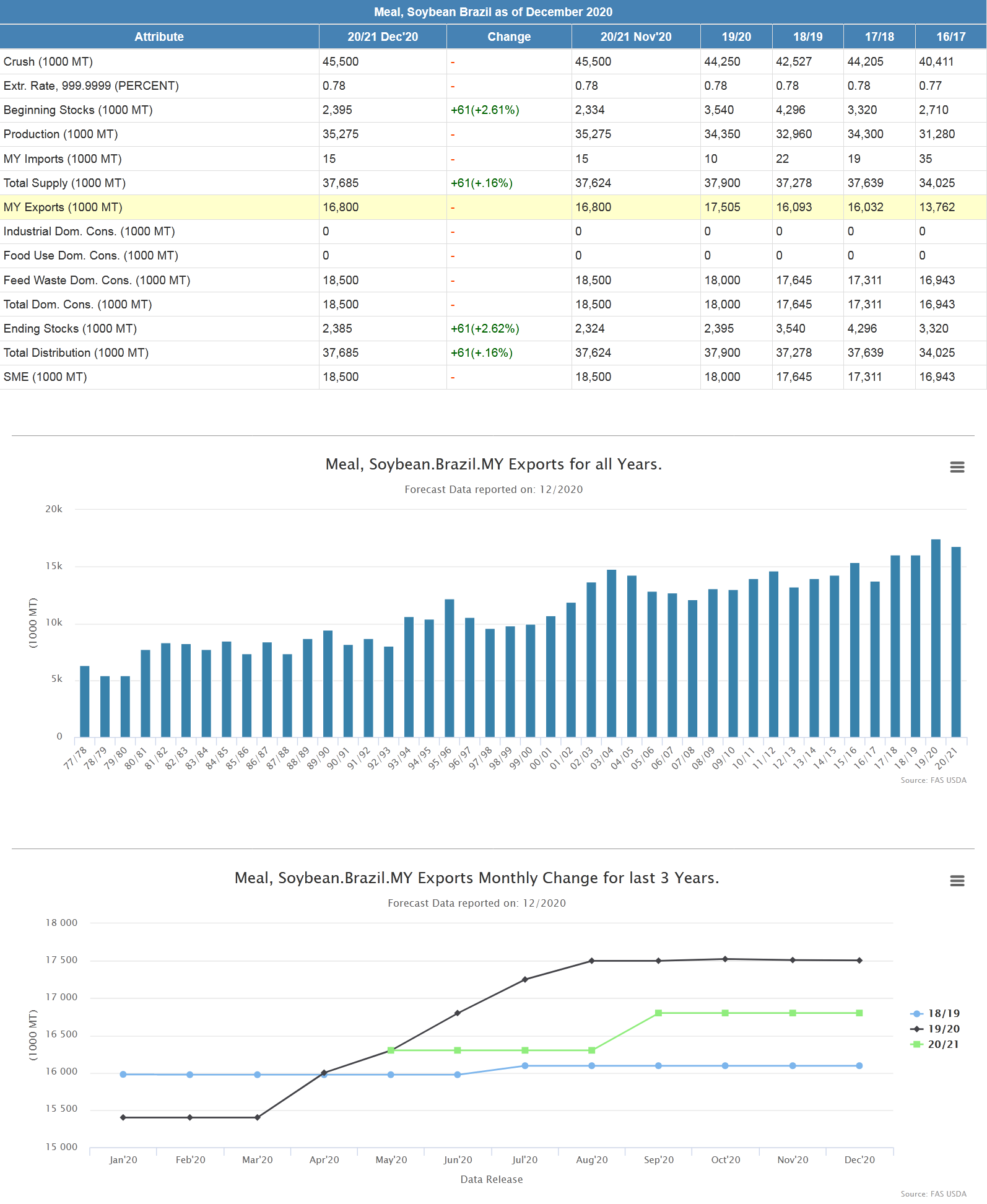 Аналитики USDA, в своем декабрьском обзоре, оставили прогноз по экспорту соевого шрота из Бразилии на уровне 16,8 млн. тонн, без изменений.