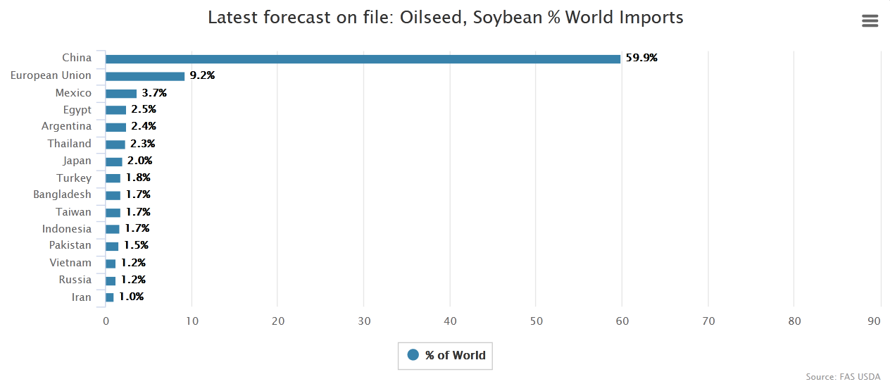 Объем производства сои в Китае был пересмотрен с 17,50 до 19,60 млн тонн на 2020/2021 маркетинговый год сообщает oilworld.ru со ссылкой USDA. Также, было увеличено потребление сои для домашних нужд на 0,3 млн тонн до 117,7 млн тонн. Импорт соевых бобов в Китай в 2020-2021 МГ по разным оценкам, может составить 100-105 млн. тонн. Китай является крупнейшим в мире импортером соевых бобов.