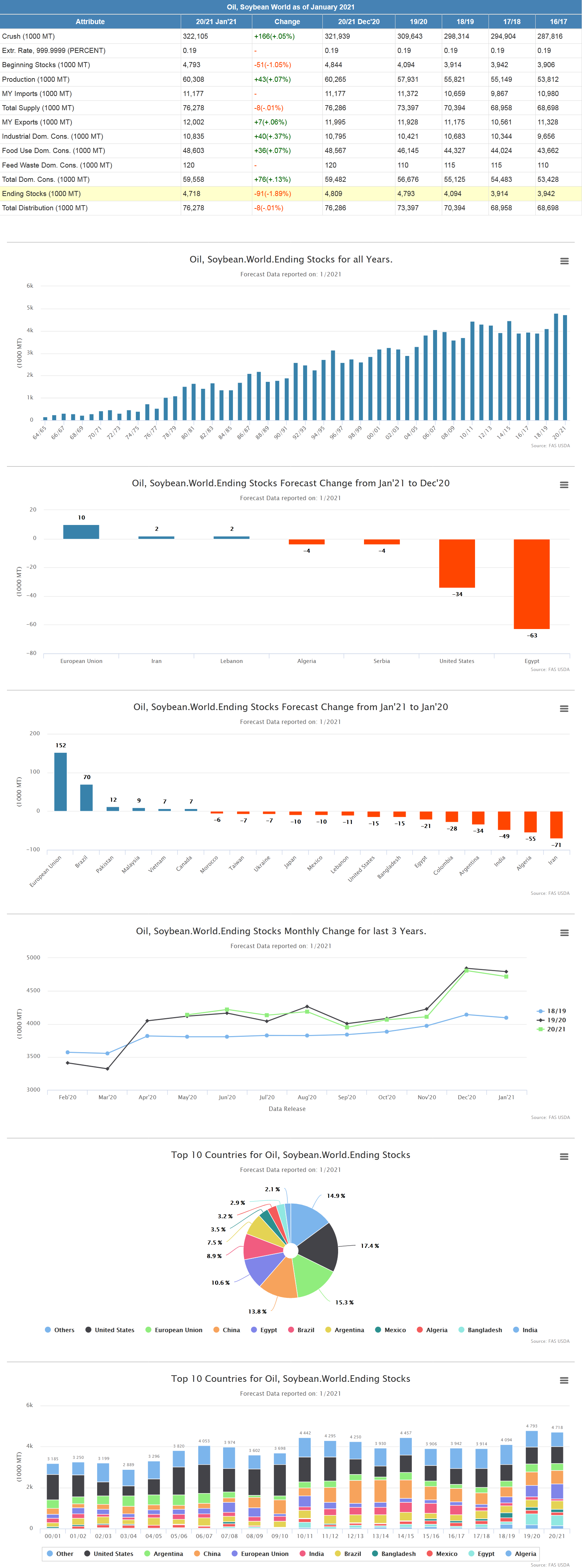 За пределами Китая потребление масличных - и продуктов питания в целом - растет аналогичными темпами, в то время как предложение не растет с такой же силой и интенсивностью. Мировые запасы уже ограничены и должны продолжать расти, но сезон 2020/21 может быть менее урожайным, чем первоначально предполагалось «Мировые запасы сильно скорректированы в США и Аргентине, но отчасти компенсируют более высокие объемы потребления в Китае», говорят эксперты USDA в своем ежемесячном бюллетене за январь. Однако китайские запасы нельзя рассматривать в общей картине по понятным причинам.