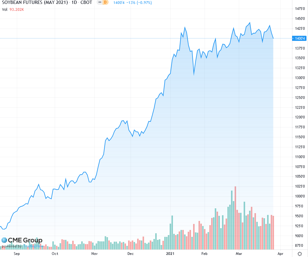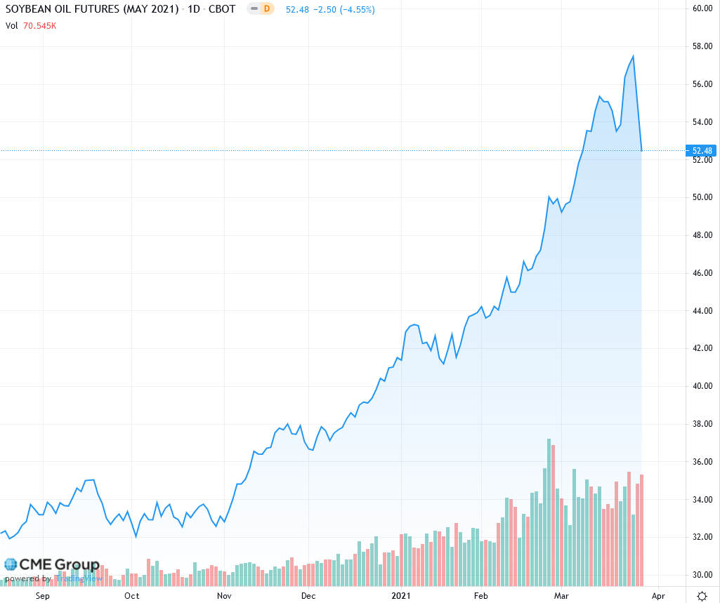 Фьючерсы на соевое масло CBOT снизили цены на соевые бобы, поскольку майские контракты на масло упали на 2,5 цента за фунт до минимума за 2-1 / 2 недели, хотя он остается около контрактного максимума, установленного на этой неделе.