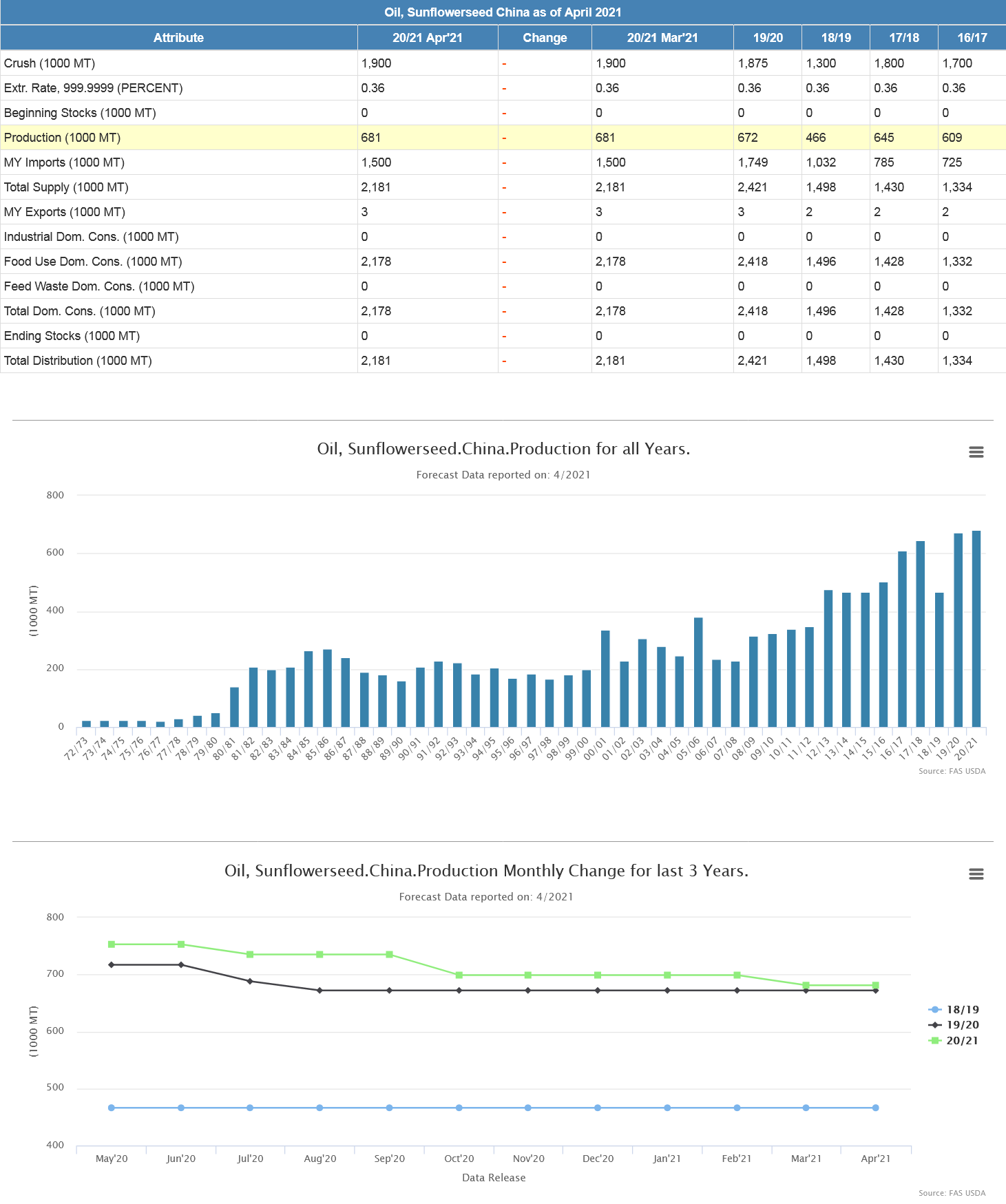 В последние годы, китайские производители семян подсолнечника столкнулись с конкуренцией со стороны большого количества импортируемых семян поэтому рост производства не столь ззначительный. USDA, прогнозирует 3,3 млн. тонн в сезоне 20/21 сообщает oilworld.ru.
