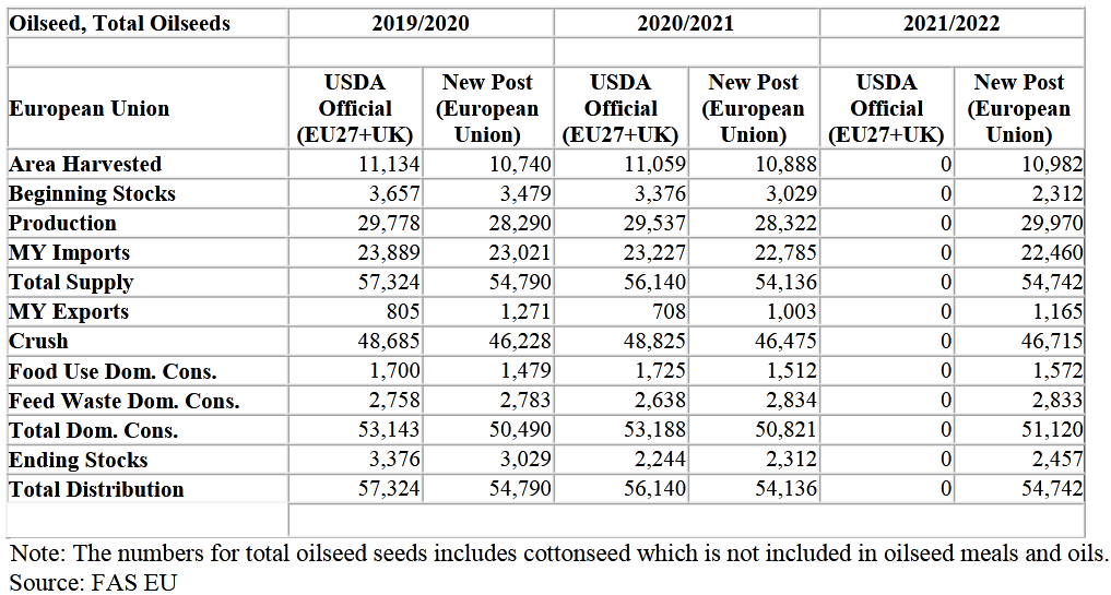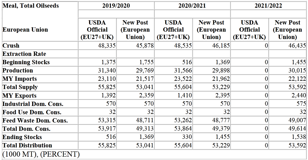 Перспективы на 2020/21 маркетинговый год весьма неопределенны и зависят от открытия вышеупомянутых секторов и восстановления экономики. С 1 января 2021 года отделение Соединенного Королевства (Великобритании) от Европейскокого Союза (ЕС) завершено, положив конец свободной торговле между экономиками обеих стран. Великобритания больше не является членом таможенного союза ЕС и теперь считается третьей страной. Это первый консолидированный отчет Глобальной сельскохозяйственной информационной сети ЕС по масличным культурам (GAIN), в который не входит Великобритания. ЕС в этом отчете относится к оставшимся 27 странам-членам. В настоящее время неясно, как будет развиваться торговля с Великобританией и через нее.