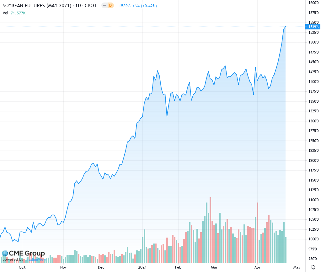 23.04.21 CBOT. Соевые бобы растут восьмую сессию подряд. Соевое масло около 13-лентних максимумов