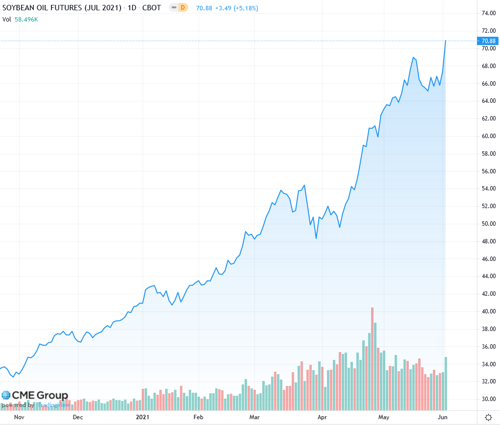 Соевое масло выросло на 4%, на фоне опасений по поводу ограниченных мировых поставок пищевых масел. Цены закрытия побили многолетнии максимумы. Поддержку ценам оказал рост на рынке нефти, также, продавцы отметили снижение спроса на соевый шрот.