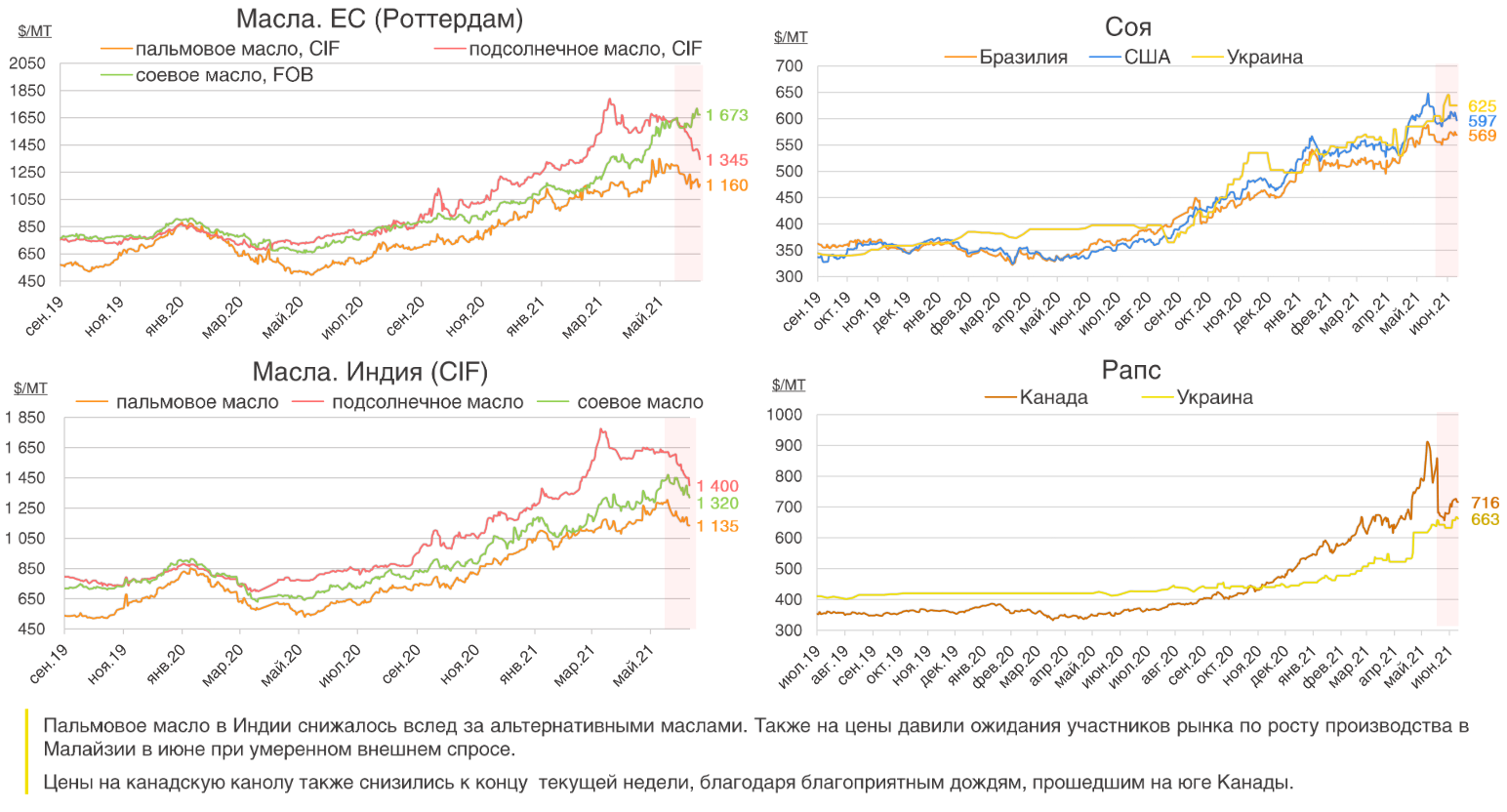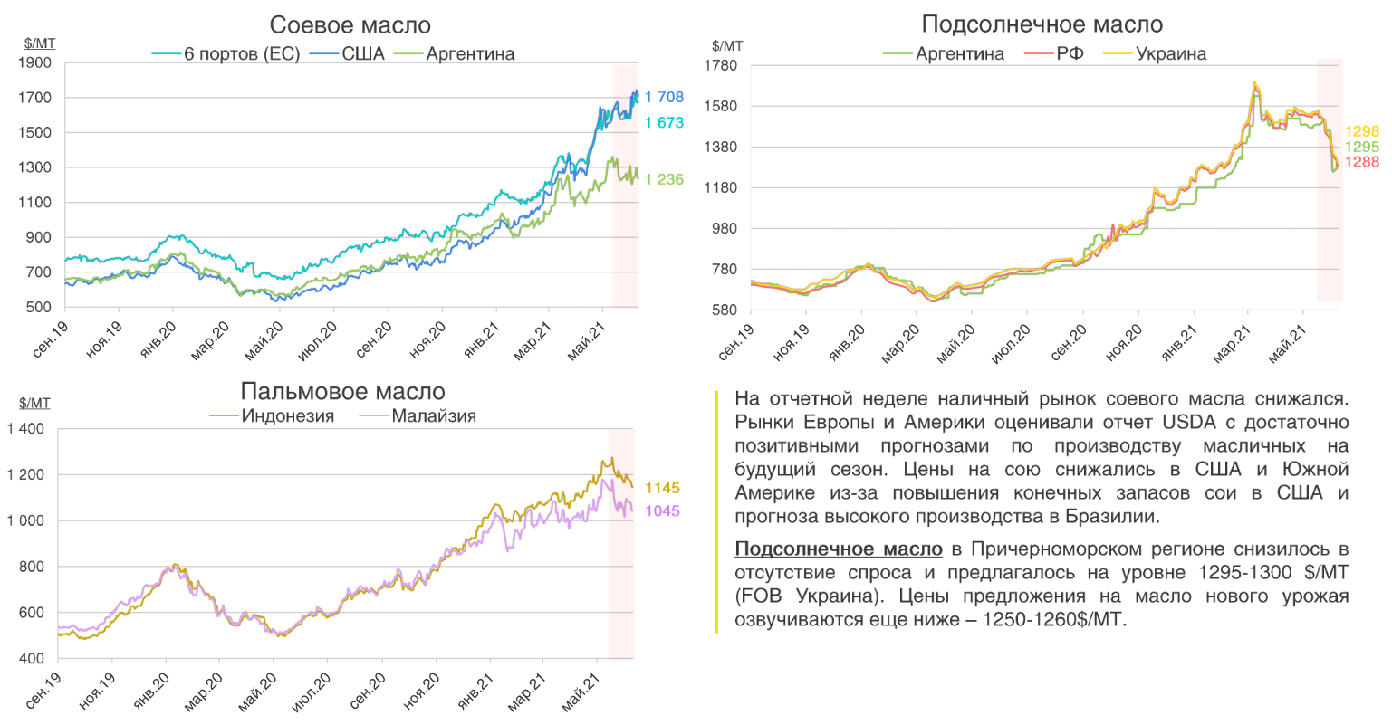 - Рапс на EuroNext снизился на 9$/МТ и торгуется на уровне 645$/МТ из-за повышения прогноза производства в ЕС в сезоне 2021/22 до уровня 17,2 ММТ. По оценке USDA майские дожди в ЕС повысили урожайность культуры, которая пострадала от засушливой погоды апреля. Также снижалась стоимость канолы в Канаде в результате недавних дождей на юге страны.