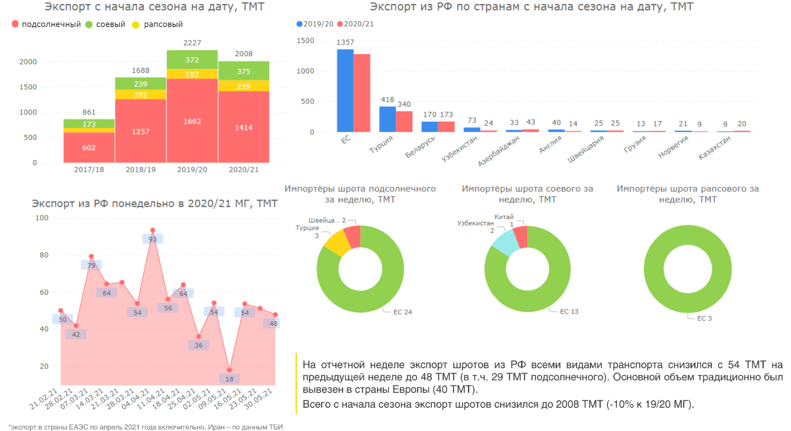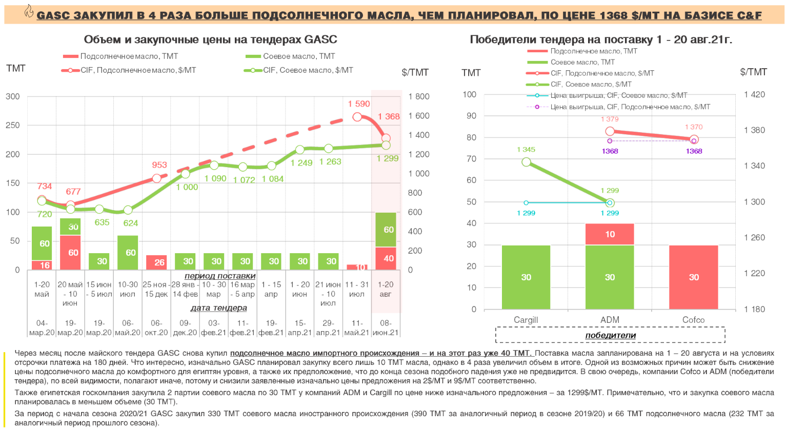 GASC закупил в 4 раза больше подсолнечного масла, чем планировал: 40 ТМТ по цене 1368 $/МТ на базисе СIF. Поставка масла иностранного происхождения запланирована на 1 — 20 августа и на условиях отсрочки платежа на 180 дней. Одной из возможных причин увеличения объемов закупки может быть снижение цены подсолнечного масла до комфортного для египтян уровня, а также их предположение, что до конца сезона подобного падения уже не предвидится. Также египетская госкомпания закупила 60 ТМТ соевого масла у компаний ADM и Cargill по цене ниже изначального предложения - за 1299$/МТ. Примечательно, что и закупка соевого масла планировалась в меньшем объеме (30 ТМТ).