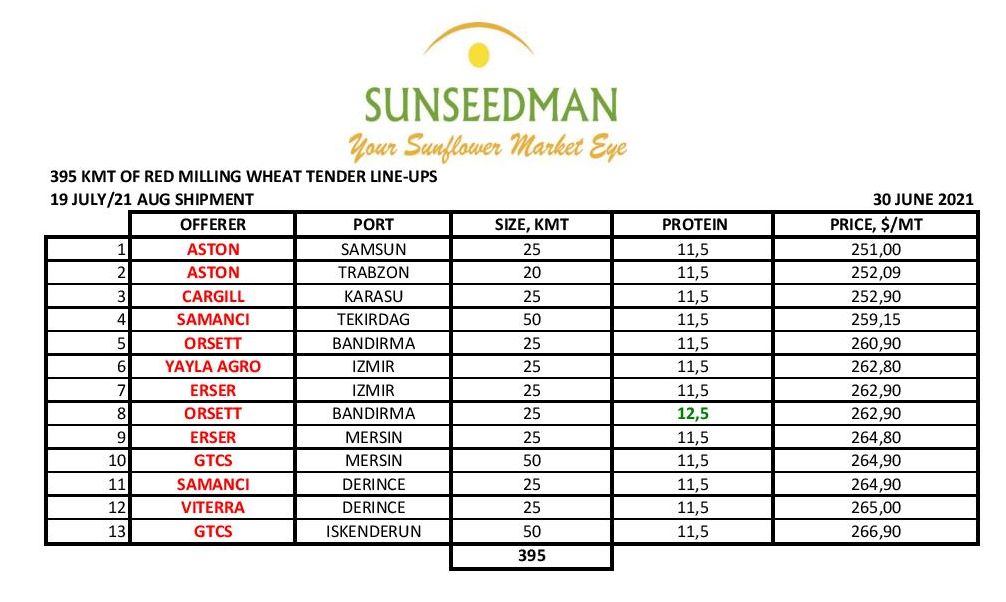 Зерновое агентство Турции (ТМО) на тендере 30 июня закупило 395 тыс. тонн краснозерной мукомольной пшеницы с отгрузкой 19 июля – 21 августа. Сообщает агентство Зерно Он-Лайн со ссылкой на европейских трейдеров.