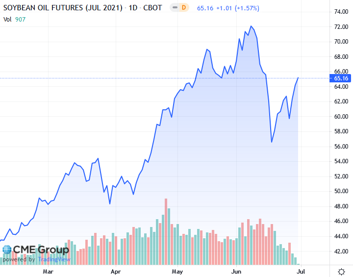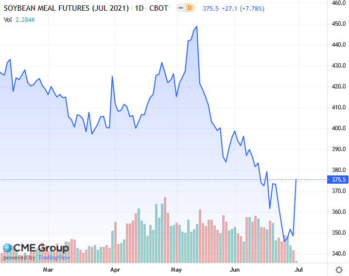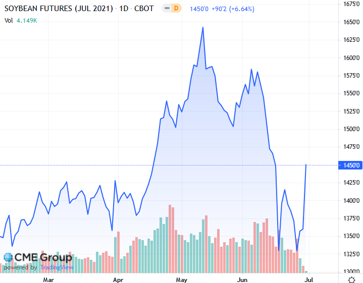 Министерство сельского хозяйства США сообщило, что фермеры США засеяли сою на 87,555 млн акров, что ниже ожиданий аналитиков в 88,955 млн. В квартальном отчете о запасах USDA сообщило, что внутренние запасы сои на 1 июня достигли шестилетнего минимума в 767 миллионов бушелей. Это было ниже ожиданий аналитиков в 787 миллионов бушелей. Данные указывают на то, что цены на сою необходимо повысить, чтобы снизить спрос на масличные культуры, считают аналитики. Рынок торговался с понижением перед тем, как USDA опубликовало данные о посевных площадях и запасах.