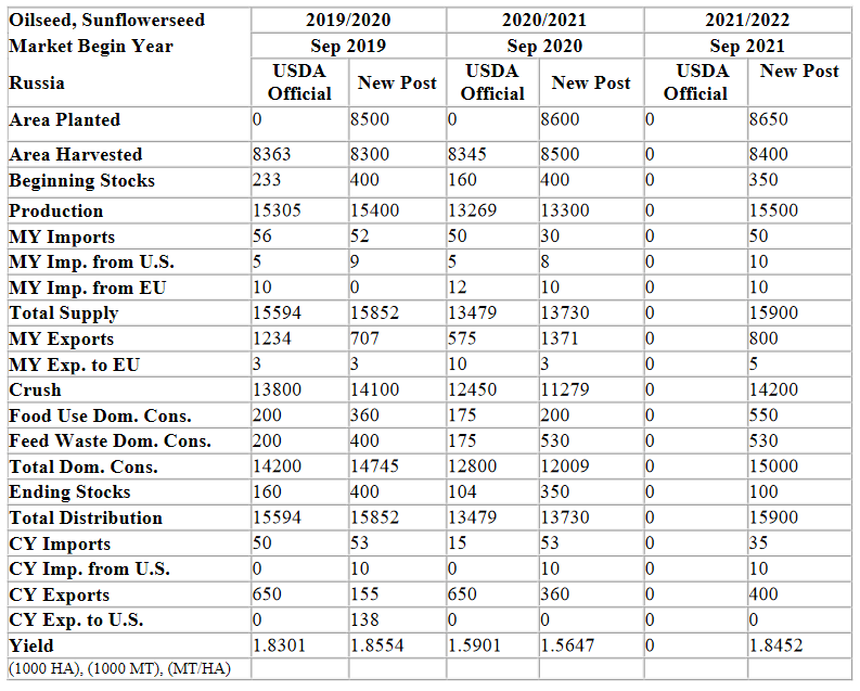 FAS USDA Moscow прогнозирует незначительное увеличение посевных и убранных площадей подсолнечника в предстоящем сезоне - с 8,6 млн га в МГ. 2020/21 до 8,7 млн га в 2021/22 МГ. Планируется, что урожай составит 15,5 млн т. Согласно прогнозам, общее внутреннее потребление вырастет до 15,2 млн т в связи с увеличением потребления домохозяйствами и удовлетворением потребностей перерабатывающей промышленности. На экспорт масличных семян подсолнечника повлияет 30-процентная повышенная экспортная пошлина.
